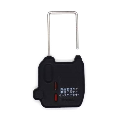 南京錠型で破壊耐性に優れ、無理矢理外そうとすると中身のインクが飛び出し商品を台無しにしてしまう為、単独で防犯性の高いプラスチック製タグです。